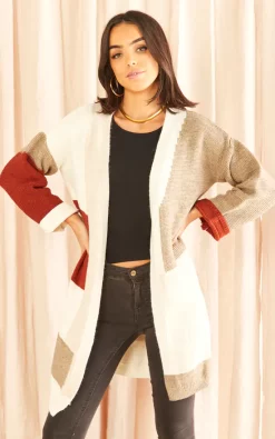 Long Sleeve Knitted Cardigan in Beige/Orange (Terracotta) colour block. Longline cardigan is super warm and stylish.