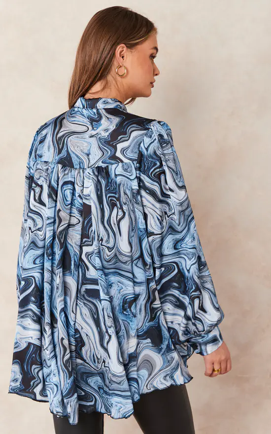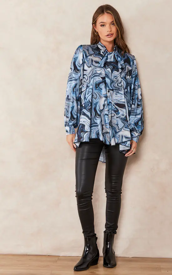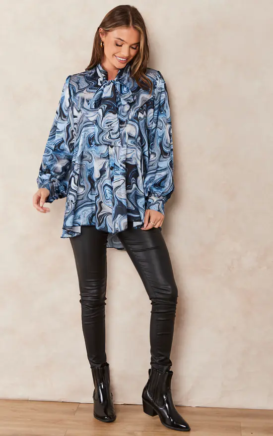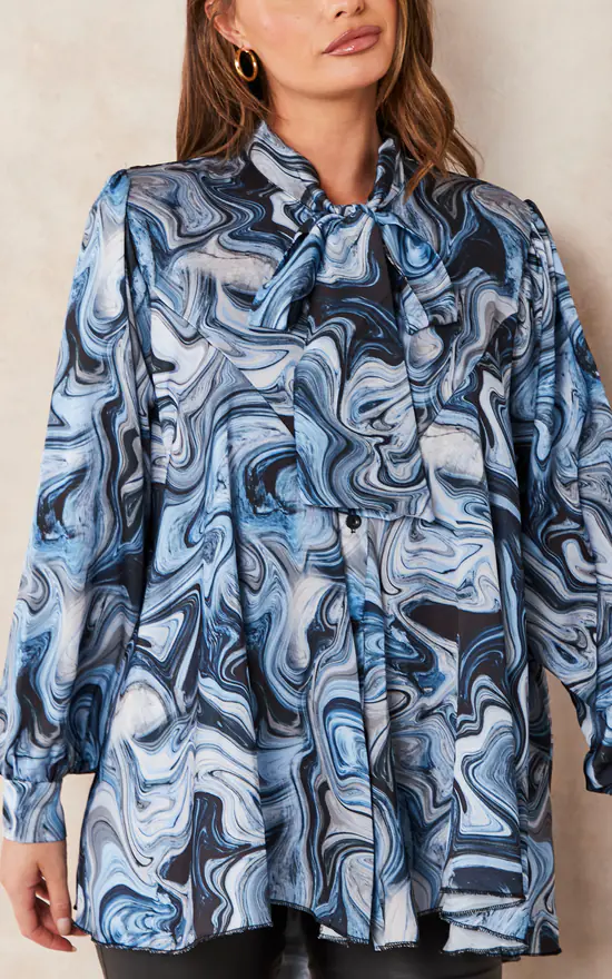 Oversize High Neck Blouse with Bow in Blue Abstract print. Perfect elegant shirt for any occasion.