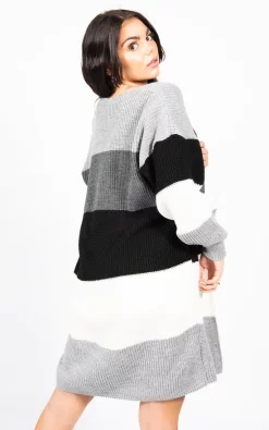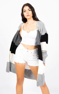 Update your cardigan collection with this gorgeous grey Colour Block Longline Cardigan. Featuring colour block stripes for its statement finish. What’s not to love about this fashionable piece?