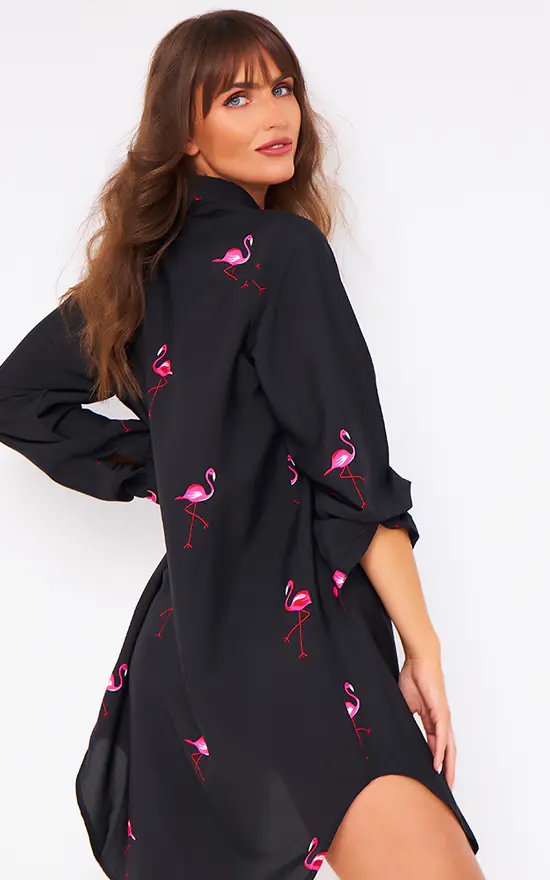 Kitten Beachwear oversized black boyfriend shirt with flamingo print.