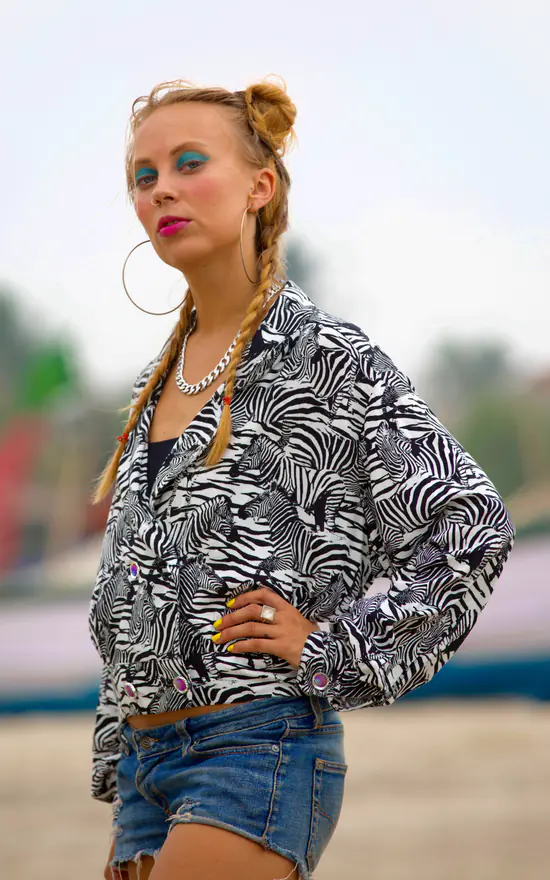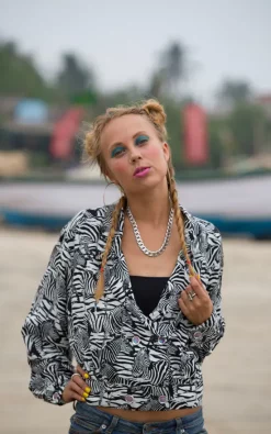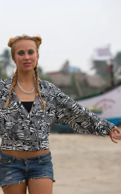 This 100% cotton printed double breasted festival shirt is single layer to be worn with swag and style. With bat-wing arms and fitted shape.