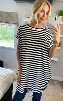 A wardrobe staple which can be worn all year round. Our 100% soft cotton tunic features stripe detail front and back, 2 side pockets and round neck. Woven classic striped design, and long line high low hem.