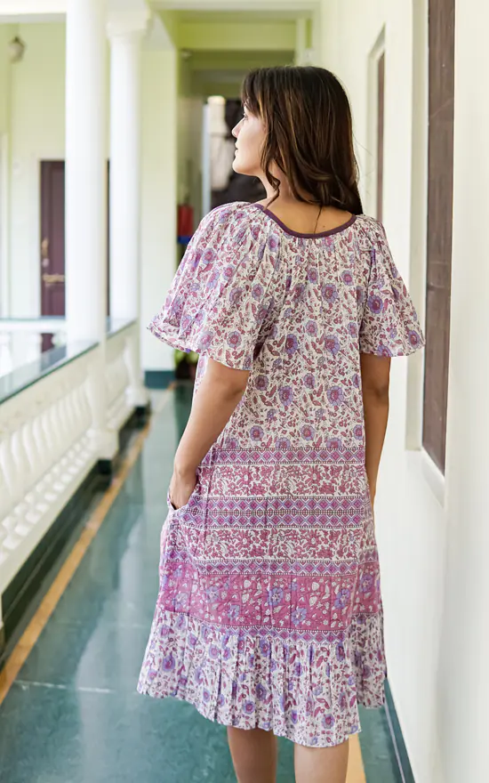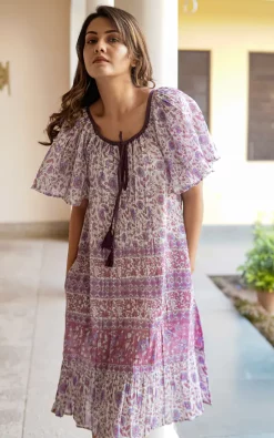 This dress is pure summer. Floaty cotton, scoop neck, a delicate purple, lilac and white print, tassel ties, handy pockets and a super flattering cut. Knee length on our 5’7″ model, it has a relaxed fit to keep you cool in hot weather.