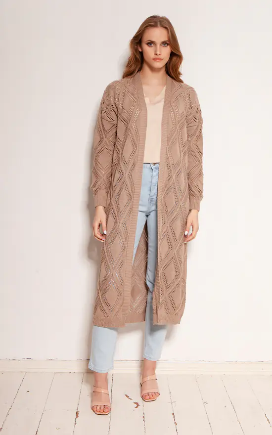 Lightweight cotton button-up sweater with drop-sleeves. Despite the loose cut, it does not add weight – thanks to the deep V-neckline. Openwork patterns match romantic dresses, but this sweater is so versatile that you can wear it with jeans as well. For work, for a party, for everyday use.