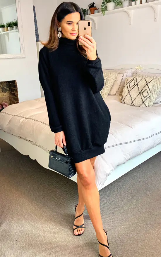 Keep it simple this season with this must-have oversized black jumper dress with pockets! Featuring a ribbed knit fabric with long sleeves and roll neck, we love this styled this with some ankle boots for a chic everyday look. Super cosy and comfy, perfect to lounge in when working from home.