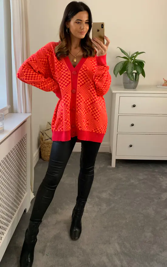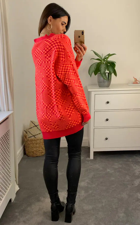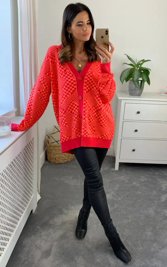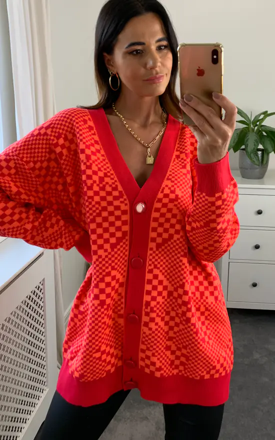 Geometric shapes take this cardigan from classic to reinvented. The contrasting buttons, collar & cuffs create an eye catching piece worth warming to & it will keep you warm too! Also available in other colourways & patterns, get them all before they’re gone.