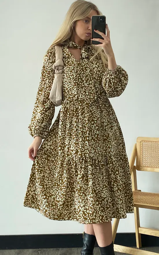 Khaki Leopard print tiered midaxi dress with necktie detail.