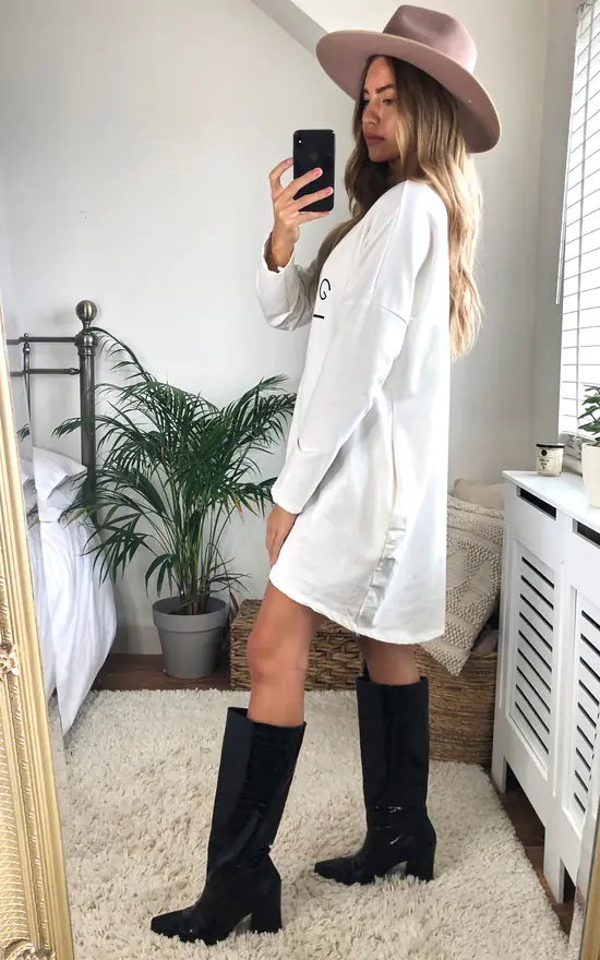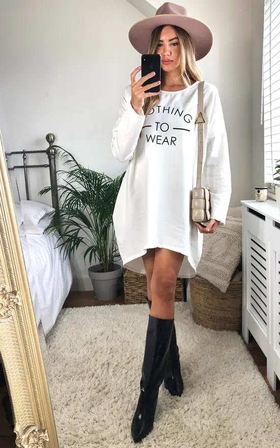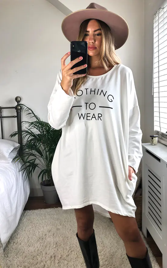 Cute, oversize sweat dress with long sleeves and pockets features ‘nothing to wear’ slogan. This jumper will become your best loungewear choice for a comfy night in or out.