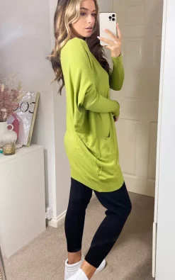 Soft, high quality italian knitwear made of sustainable viscose and microfibre. The knit features oversize design, batwing long sleeves, boat neckline and pockets. Available in black, beige and green.