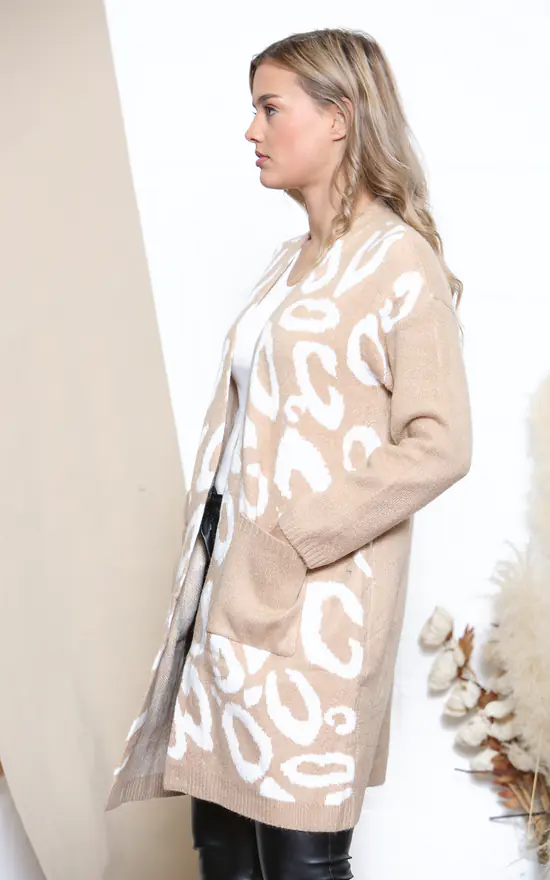 This smart cardigan is a must have this season. With leopard print front panels and a plain rear for a modern look. Long sleeves and warm fabric make this cardigan perfect for staying warm this winter. This is perfect for work or a range of occasions.