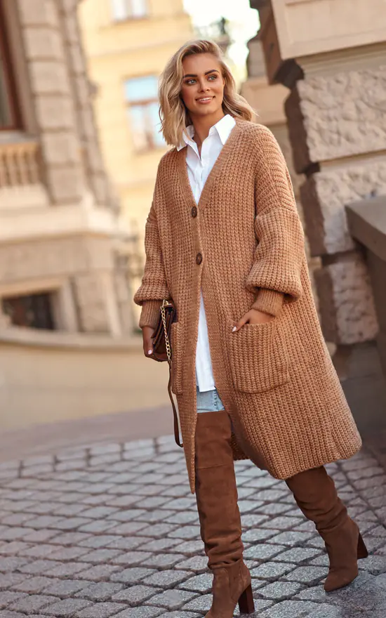 Long ladies’ jumper with cheese neckline, woven on loose eyes, with pockets at the front. The jumper is fastened with two large buttons. It is classic and slightly retro-inspired. It is perfect for wearing with trousers and a dress. It can be worn with a tulle skirt and massive boots. It is suitable for both casual and more formal styles. The jumper is made of woolen yarn with a mixture of synthetics, which increases wearing comfort and promotes easy care. The sleeves are finished with welts.