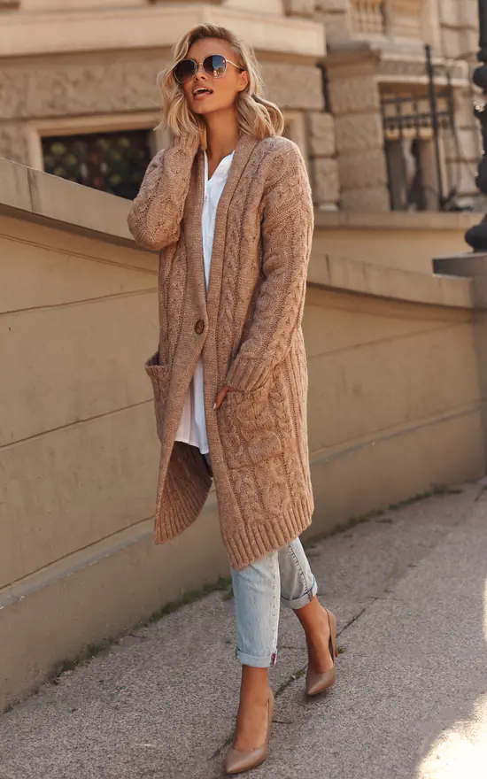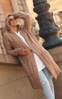 Long and fleshy women’s jumper, woven in decorative braids, buttoned up. The model also includes practical pockets. The welts are located at the bottom and on the sleeves. The jumper is soft to the touch and extremely pleasant to contact with the skin. It is very effective in keeping warm and enveloping the body on cold days. It can be worn with trousers and a women’s shirt as well as with a romantic and airy dress. The jumper is timeless, retro style. It comes in four classic colours, ideal for women of all types of beauty.