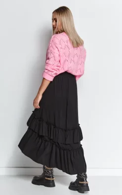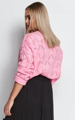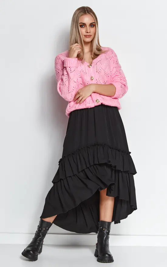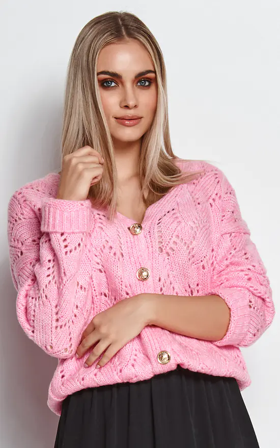 Romantic and extremely feminine women’s jumper with openwork weave is complemented by elegant gold buttons. This is the perfect jumper model for every woman with a romantic soul. The heart neckline perfectly emphasizes the collarbones and optically extends the neck. The jumper has a loose cut, which ensures freedom of movement when worn. It is very soft and pleasant to the touch. It will look great with many different stylizations, including both casual and business looks. Every woman will find the perfect model for herself, because this jumper comes in many colours.