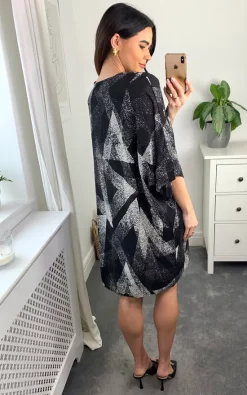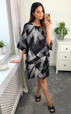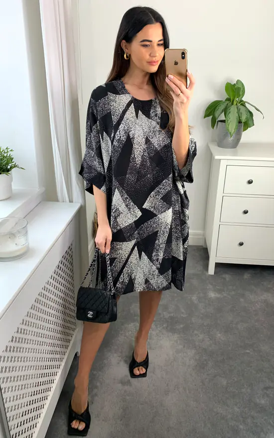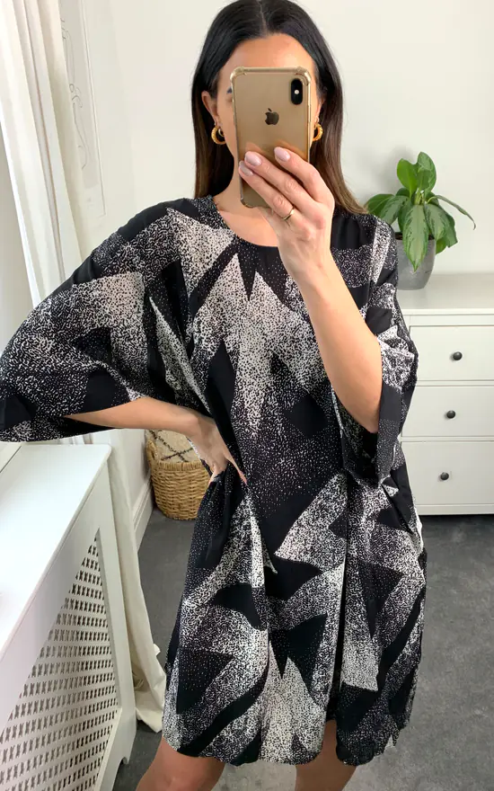 This dress features a striking, monochrome abstract print perfect for all seasons year round and is cut in an easy pull on style and designed in a loose, oversized look, which will suit all body shapes. Can be worn loosely, belted, with leggings or jeans, as a tunic or dress, the versatility is endless. Team with white trainers and a denim jacket for a more casual weekend vibe or add your favourite sandals and you have the perfect outfit for days dining alfresco in the sunshine.