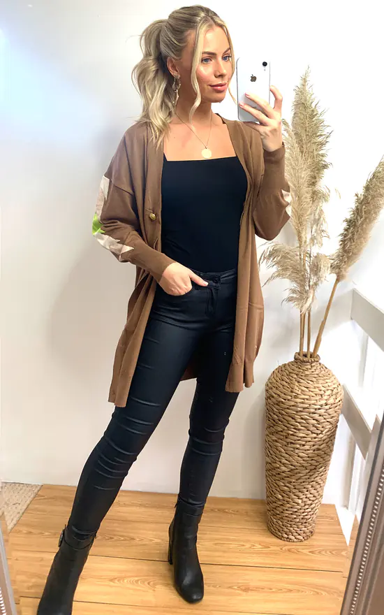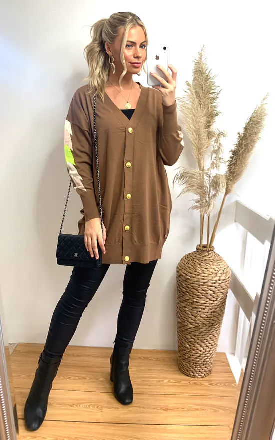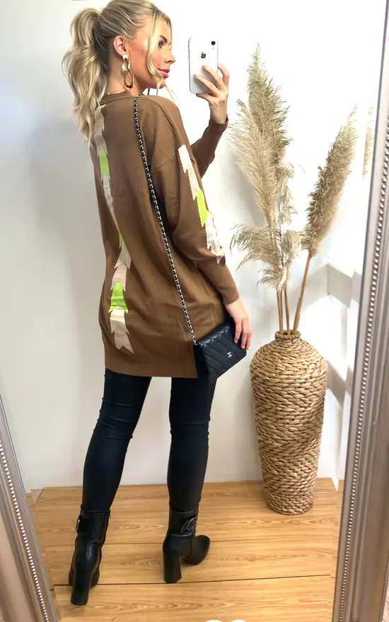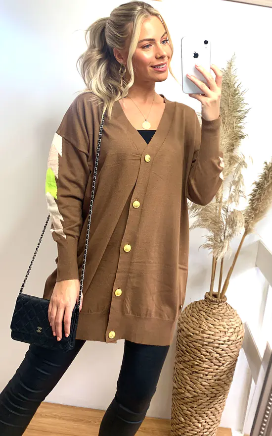 A stunning go-to piece for those who love layering up as the weather turns chilly.The eye-catching contrast, chevron design at the back and down each sleeve gives this knitwear a sporty edgy vibe, as well as adding pops of colour to your winter wardrobe. Button through and cut in a slimline boyfriend style. Wear as part of your work wear or add your favourite trainers and you have a a great causal luxe outfit.