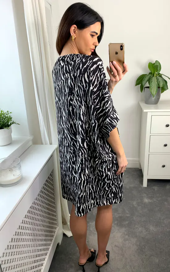 This woven dress features a striking, monochrome print perfect for all seasons year round and is cut in an easy pull on style and designed in a loose, oversized look, which will suit all body shapes. Can be worn loosely, belted, with leggings or jeans, as a tunic or dress, the versatility is endless. Team with white trainers and a denim jacket for a more casual weekend vibe or add your favourite sandals and you have the perfect outfit for days dining alfresco in the sunshine.