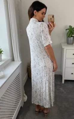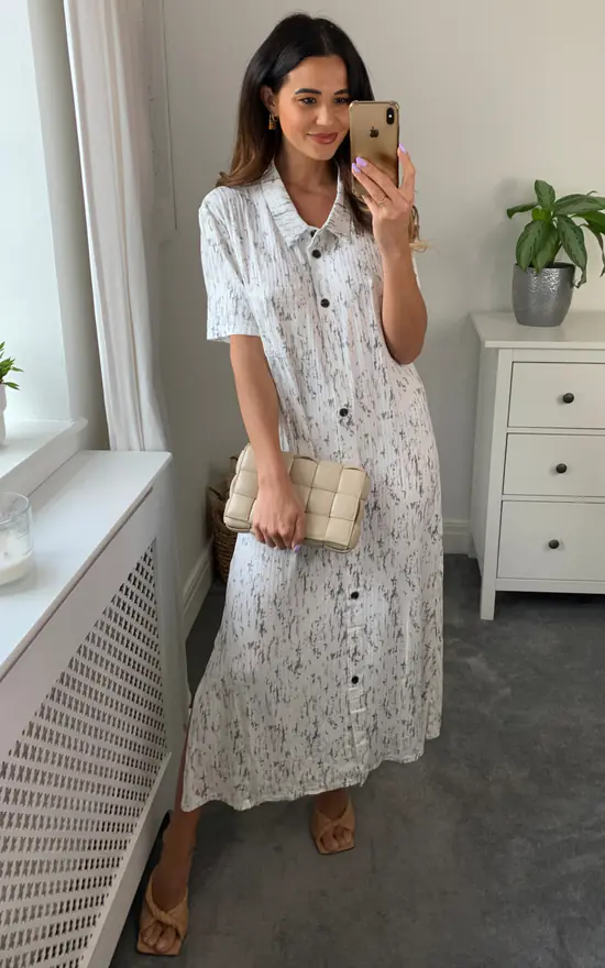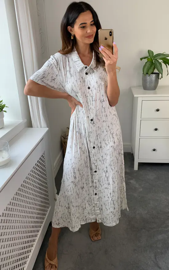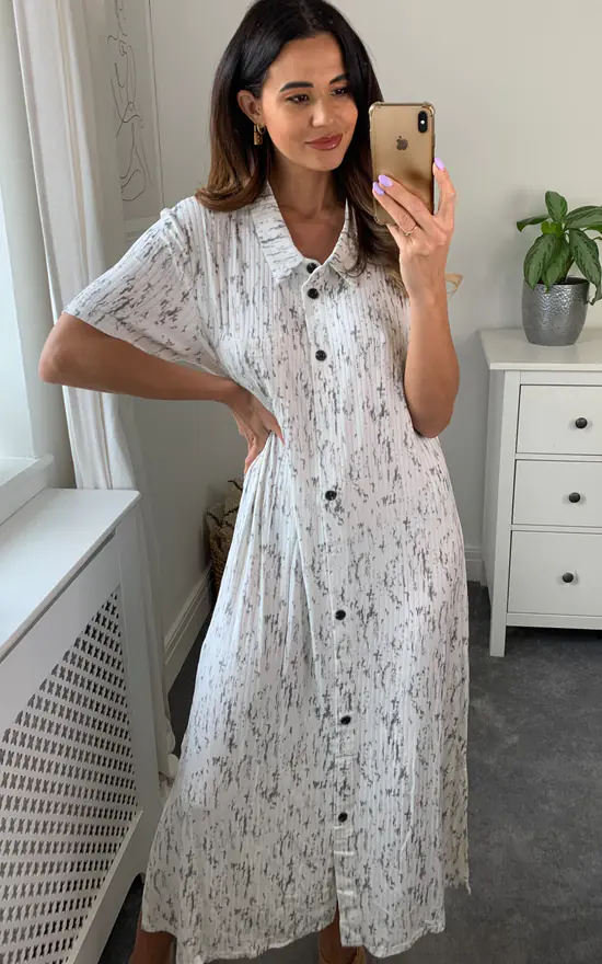 On sunny days reach for this gorgeous shirt dress. Made from a soft, stretch ribbed jersey fabric, with a button front fastening, a classic collar design, short sleeves and a front pocket for that extra finishing touch. It has an all over marble effect print and is mid-calf length, creating a flattering, elegant silhouette. A fabulous wardrobe stable that combines classic styling with a contemporary twist. Item is one size and is suitable from a size10-16 depending on the desired look you are wanting to achieve.