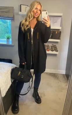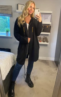 This hooded jersey parker features a stunning gold coloured embellished ‘Hamsa Hand’ slogan to the back of the jacket. Perfect for slipping on at the weekend, casual days or for cosy days at home. Additionally it can glamorize your gym wear wardrobe. Zip fastening and with drawstring detail at the top and the bottom of the jacket too.