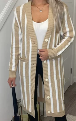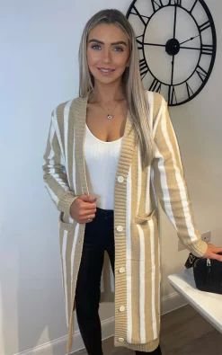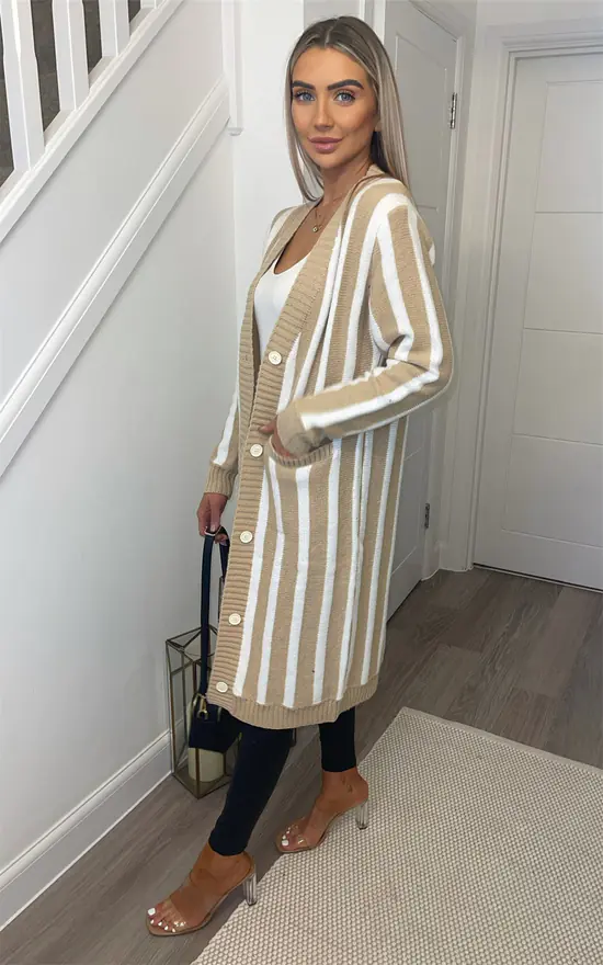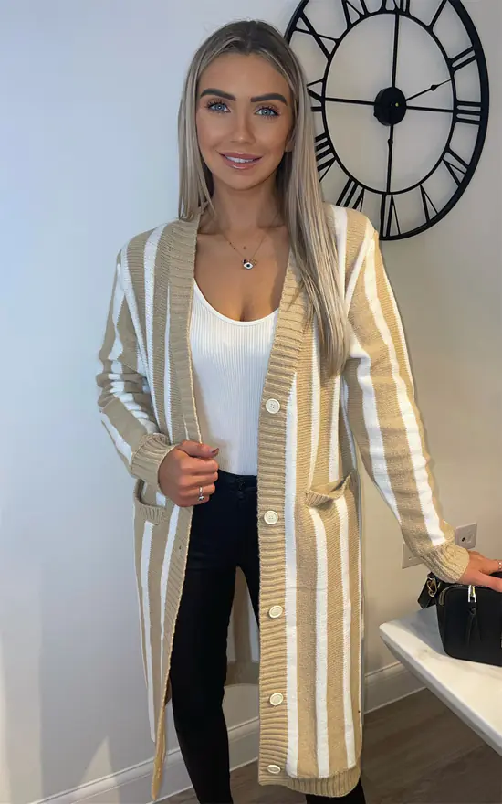 Beautiful long sleeve striped button front long knitted cardigan, perfect every day cardigan for cold weather, winter, or just casual mix and match