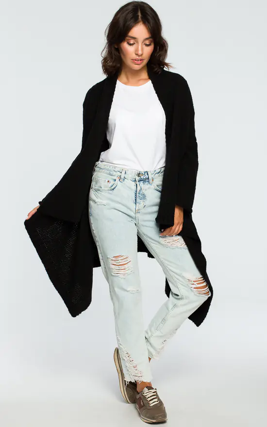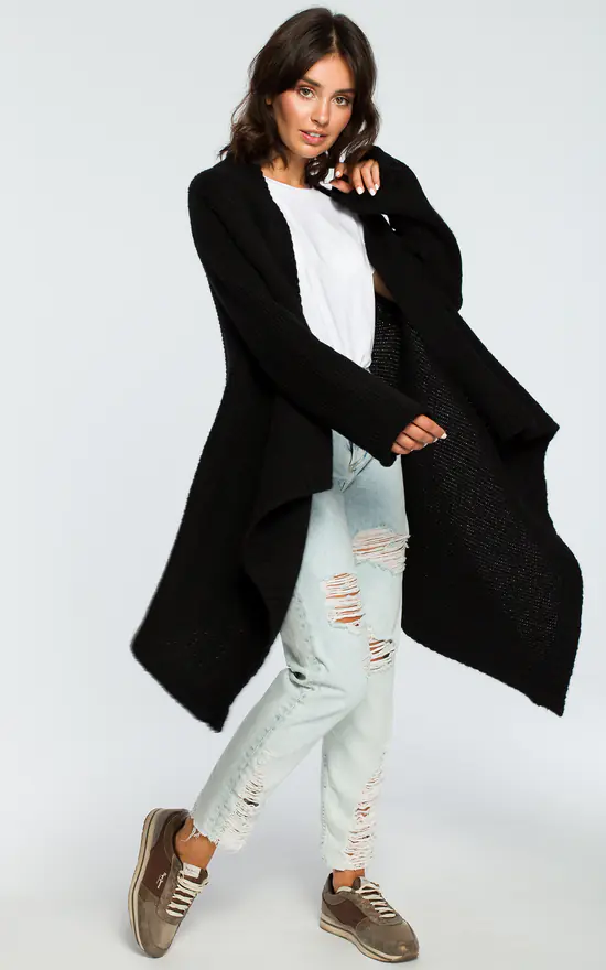 This soft knit cardigan features a draped open front, long sleeves and a trapeze hem. The longline silhouette and a relaxed fit add chic appeal to this versatile piece.