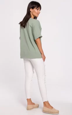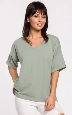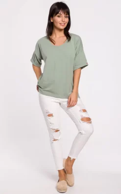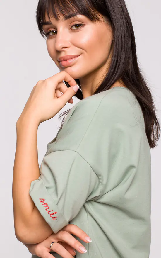 Simple but not ordinary, this 100% cotton oversized top has a nicely plunging neckline and turn-up sleeves with embodied βsmile” inscription on one side.