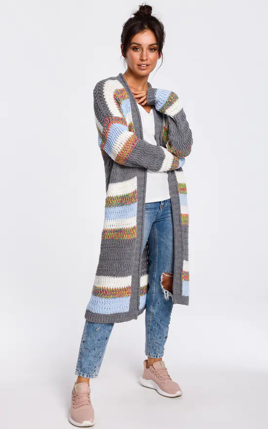 Interesting choice of colors and pattern make this longline cardigan not only a warm, but also a trendy piece you can wear both with you favorite jeans or t-shirt and a tube dress.