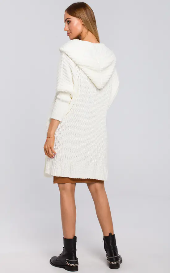This thick seed knit cardigan features a large hood and long sleeves. Wrap up in it whenever you want to feel warm and cosy.