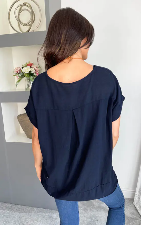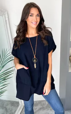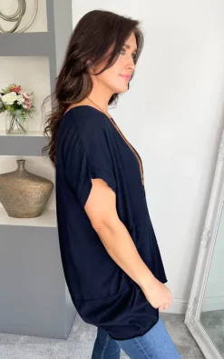 Navy Blue Short Sleeve Pocket Necklace Top is such a great staple and will look great with so many bottoms. This top also come with a beautiful necklace making it a bit different and will look perfect teamed with your favorite jeans.