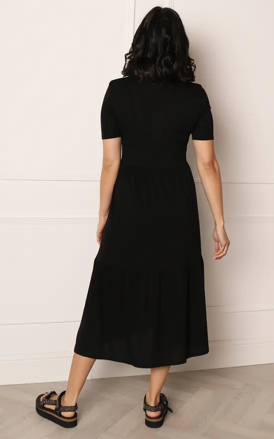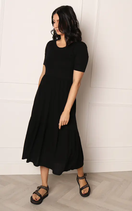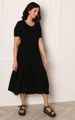Made from soft jersey fabric. Oversized style, midi length. Crew neckline & short sleeved. Oversized smock shape with gentle pleats to skirt. Loose fit. 95% Cotton, 5% Polyester. Model is 5′ 7″ and wear a