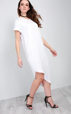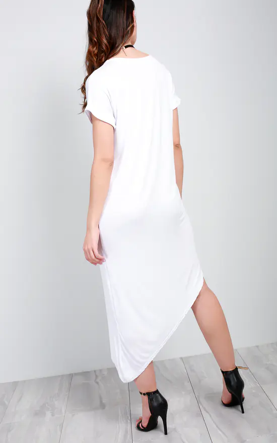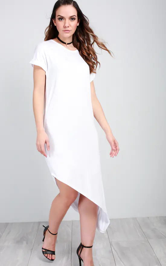 Maria Asymmetric Hem Jersey TShirt Dress features and oversize fit, roll sleeves and slanted hem. Dress it up with heels and leather jacket, or keep it casj for summer with flats and a denim jacket