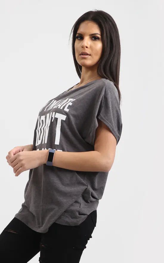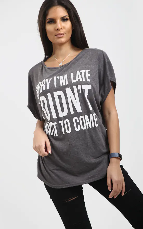 Charcoal Off Shoulder Slogan Print Oversize Tshirt features a ‘sorry im late I didn’t ant to come’ slogan and off shoulder baggy fit a relaxed fit and sporty chic graphic print.