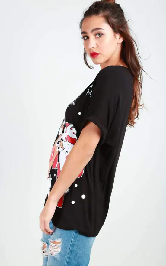 Christmas Graphic Print T-Shirt In Black ! Get ready for Christmas with this oversized tee. Featuring a Santa & Rudolph xmas print, roll sleeves and oversized fit. Team this tee with a faux leather trousers and barley theres.