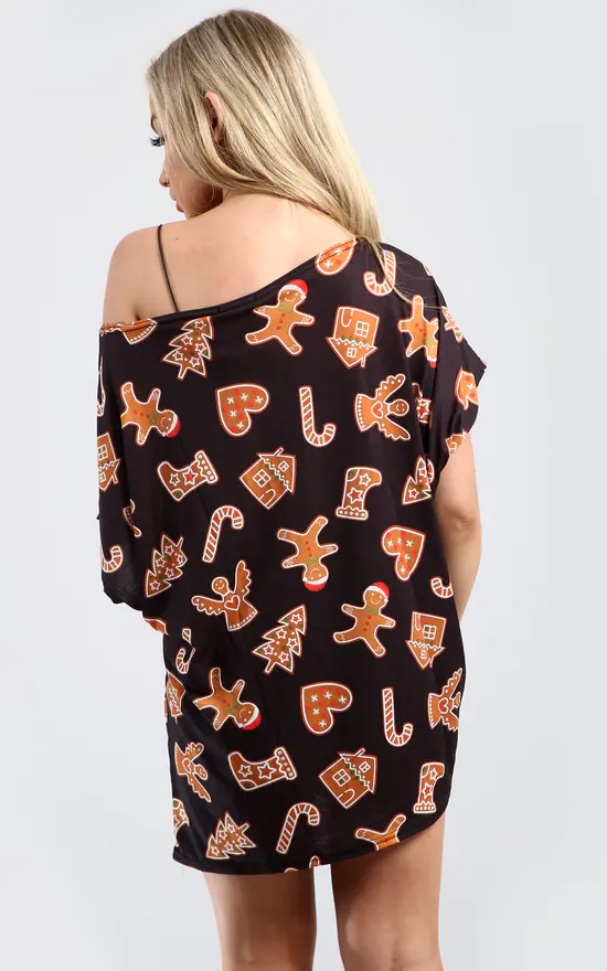 Eliza Christmas Batwing Top In Gingerbread Black ! Featuring the ho-ho-holidays this Christmas season in our Oversized Batwing Top In Gingerbread Black T shirt .