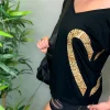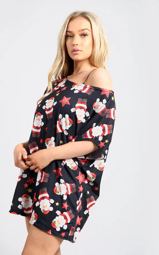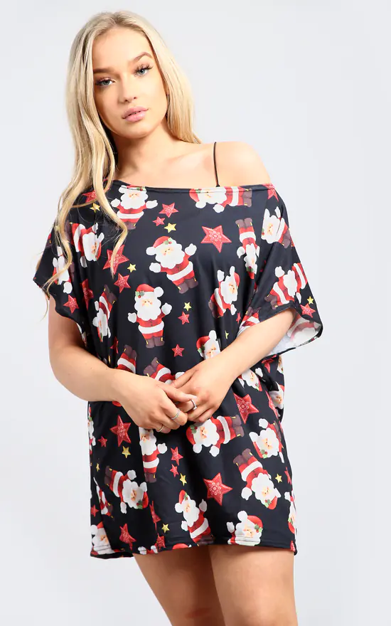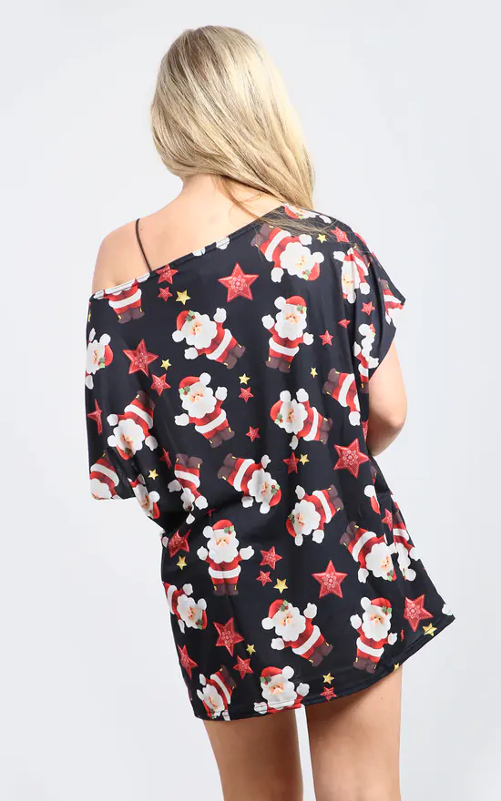 Eliza Christmas Batwing Top In Santa Snow Black! Featuring the ho-ho-holidays this Christmas season in our Oversized Batwing Top In Santa Snow Black T shirt Print.