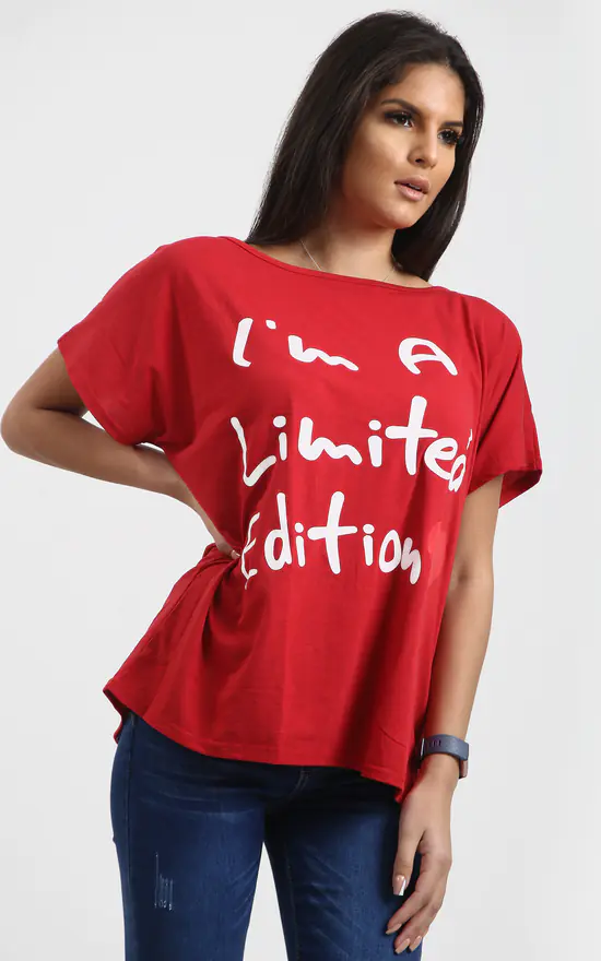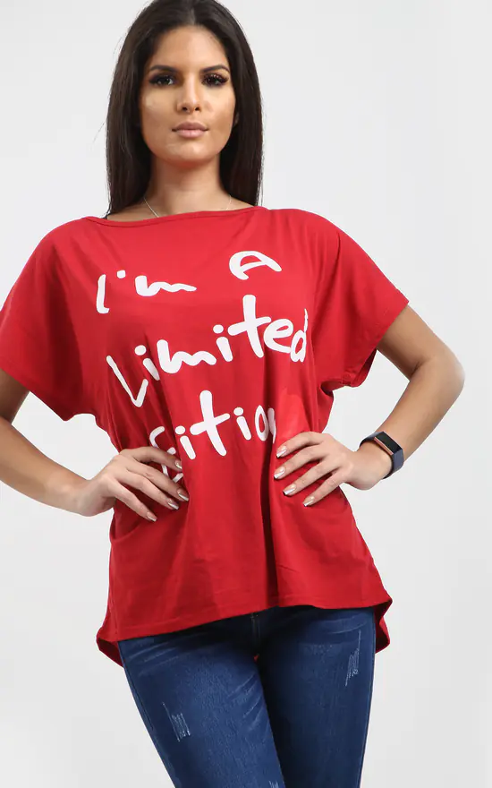 MIa Off Shoulder Slogan Print Oversize Tshirt In Red ! Features a ‘I Am Limited Edition’ slogan and baggy top a relaxed fit and sporty chic graphic print.