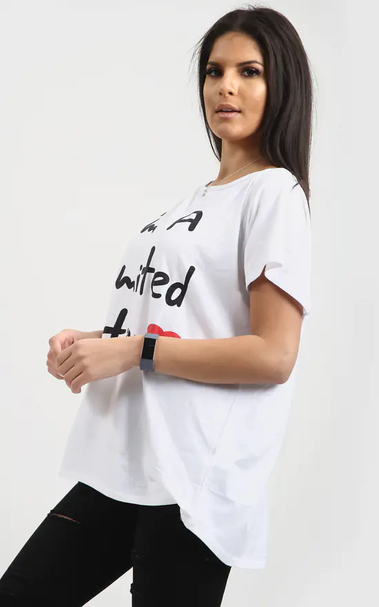 MIa Off Shoulder Slogan Print Oversize Tshirt In White ! Features a ‘I Am Limited Edition’ slogan and baggy top a relaxed fit and sporty chic graphic print.