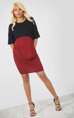 Look super sassy and slay in this Red Paneled Oversized Mini Tshirt Dress. Featuring colour black paneling and loose fit. Wear yours with trainers and a denim jacket for cool girl vibes!