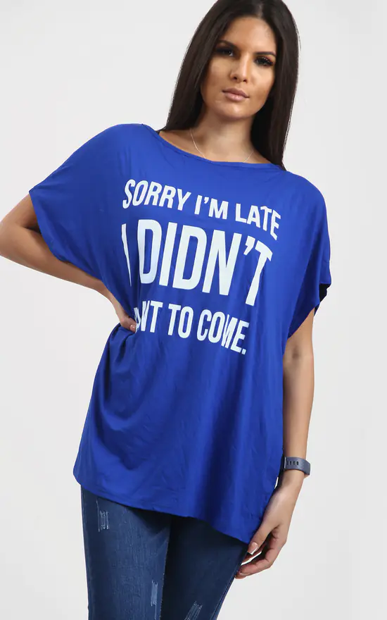 Royal Blue Off Shoulder Slogan Print Oversize Tshirt features a ‘sorry im late I didn’t ant to come’ slogan and off shoulder baggy fit a relaxed fit and sporty chic graphic print.