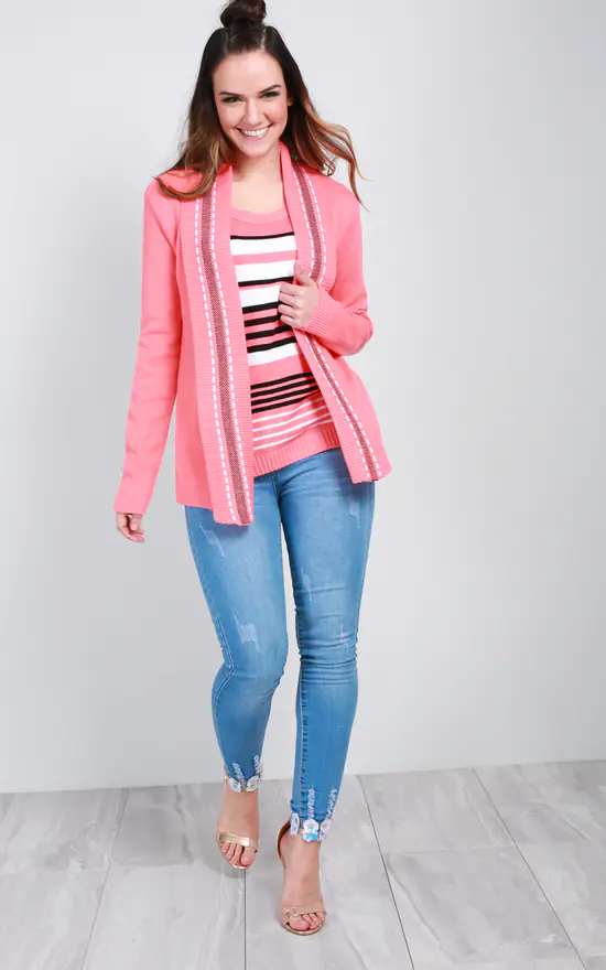 Keep cosy this winter in the Sarah Striped Knitted Twin Jumper In Pink, Featuring in a 2-in-one cardigan and striped design. wear with skinny jeans and heels