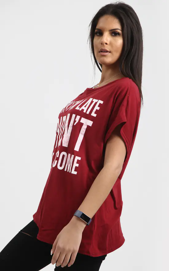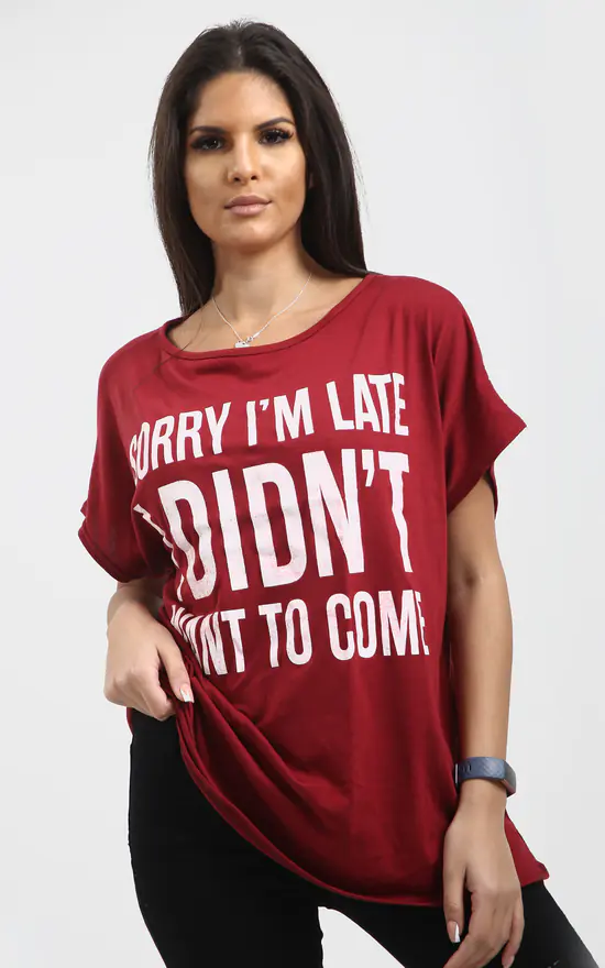 Wine Off Shoulder Slogan Print Oversize Tshirt features a ‘sorry im late I didn’t ant to come’ slogan and off shoulder baggy fit a relaxed fit and sporty chic graphic print.