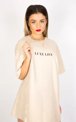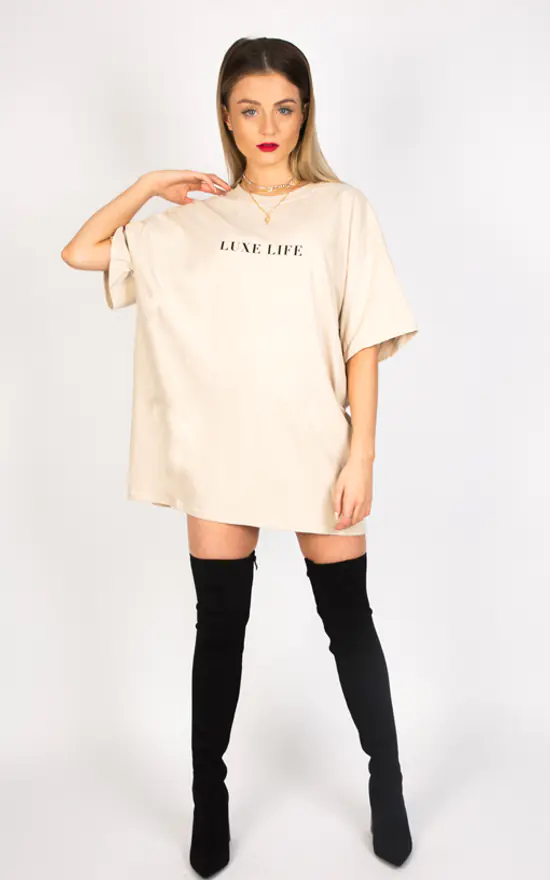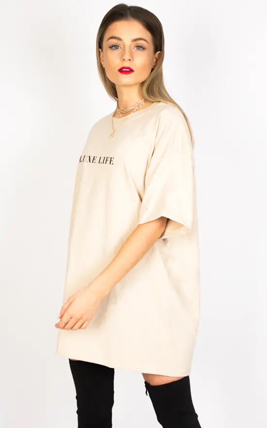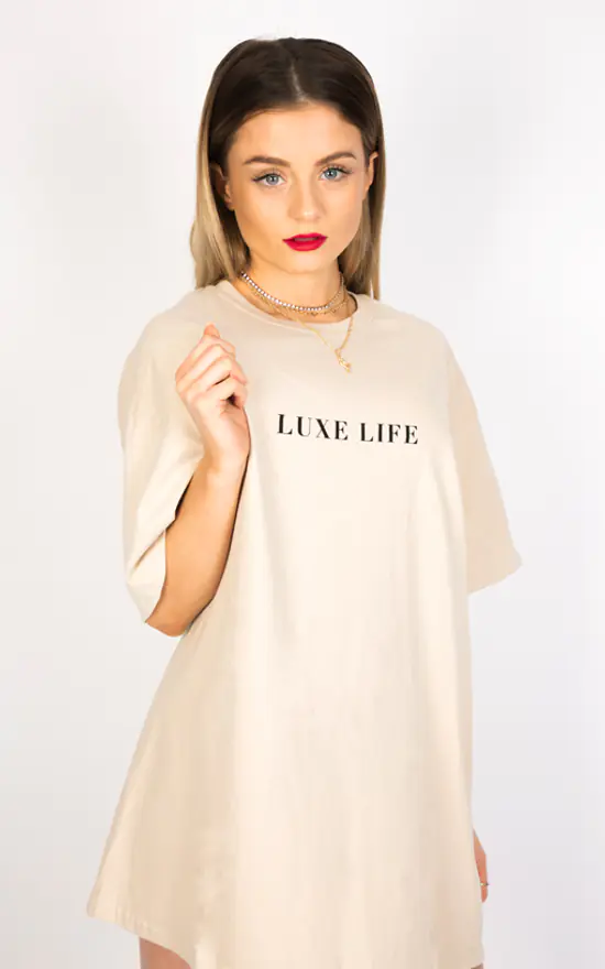 Add some Luxe to your wardrobe with our ultimate oversized slogan tee. Minimalist and simple team with our chunky chain belt for a perfect look day to night. Desert nude coloured heavy weight tee, ethically sourced, made in the U.K. Wash on 30 do not tumble dry to retain shape. Wash with similar colours.