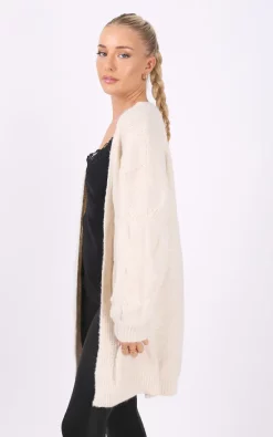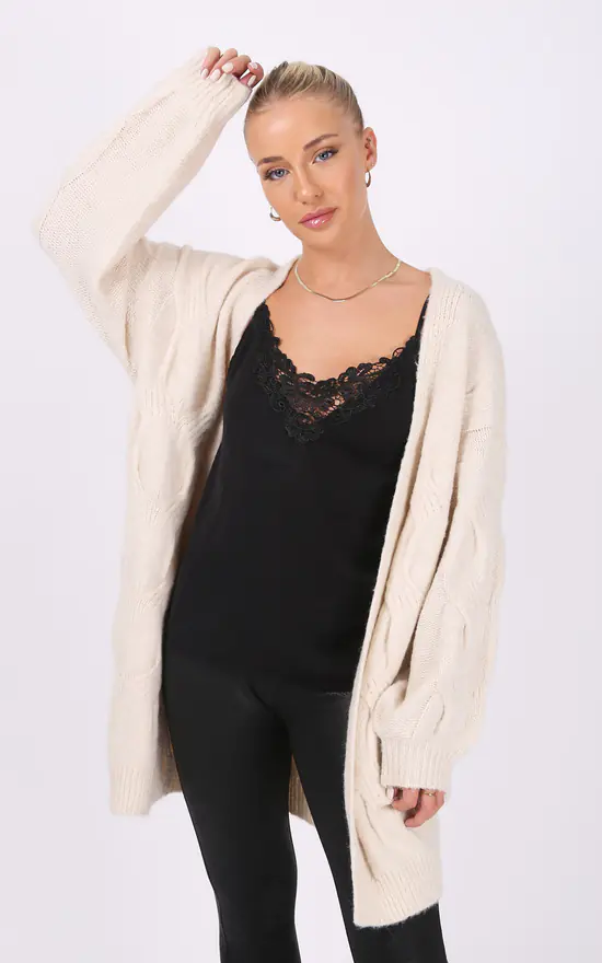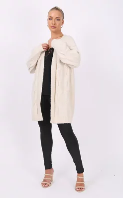Our Beige Oversized Cable Knit Drop Shoulder Cardigan is part of our latest Knitwear collection. A thick cable knit material with dropped shoulders, long sleeves and ribbed detailing finished in a oversized fit.