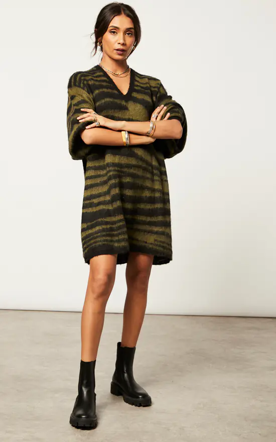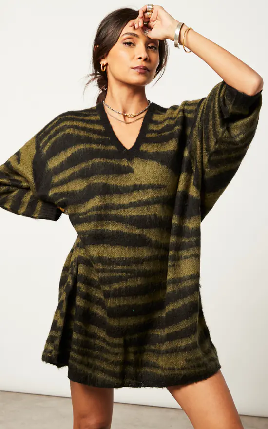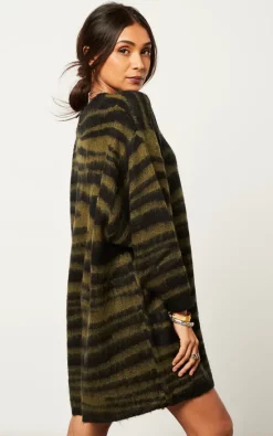 Oversized fluffy knitted tunic dress in large animal stripe in khaki and black