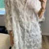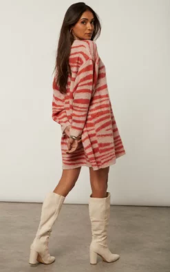 Oversized fluffy knitted tunic dress in large animal stripe in Stone and Picante burnt orange