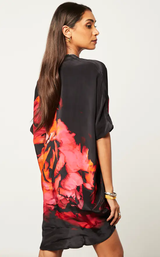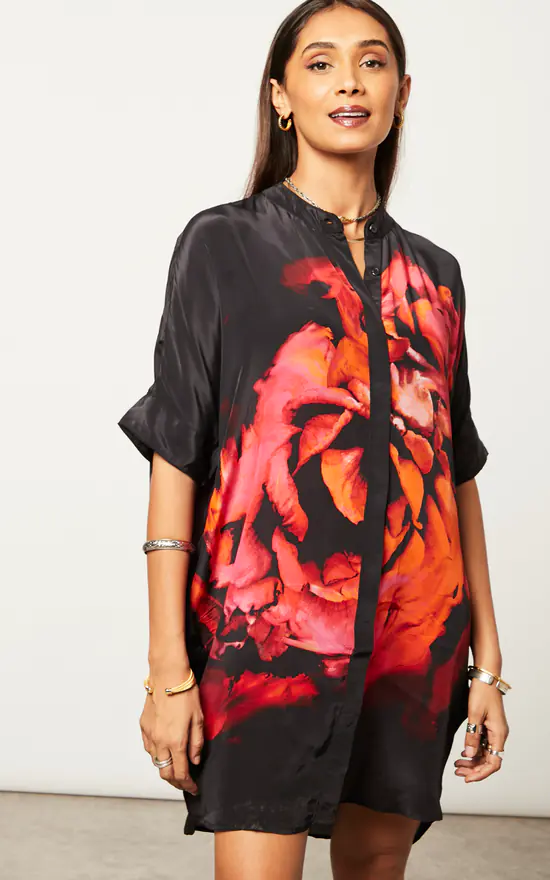 Made from cupro which is known as vegan silk, this short tunic dress has a grandad collar, short dropped sleeves and a button-through placket so it can be worn as a dress or open as a layering piece, it has side seam pockets for the essentials.