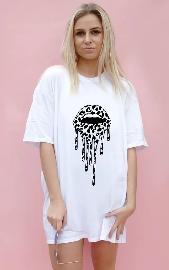 Product Code: SF-LEOPARD PRINT DRIP LIP OUTLINE TSHIRT DRESS IN WHITE