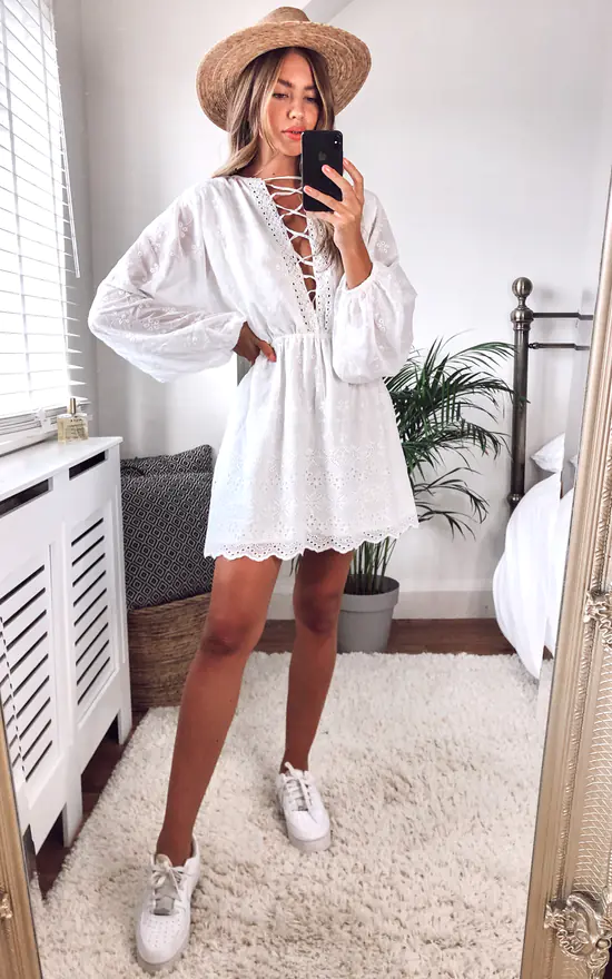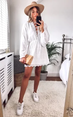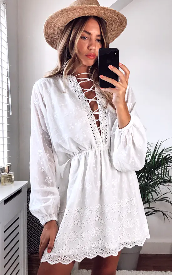 On the beach. In the bar. To the shops. The Paloma Embroidered Lace Up Dress in Ivory couldnβt be a more versatile piece, ready for anywhere youβre off to!