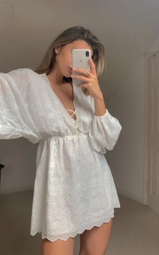 Combining all-over embroidery with a lace-up neckline detail and billowing sleeves, the Paloma Dress is the perfect summer smock dress. Pairing with trainers gives you an outfit perfect for a Friday night barbeque, while styling with espadrilles transforms the dress to the perfect boho beach dress.