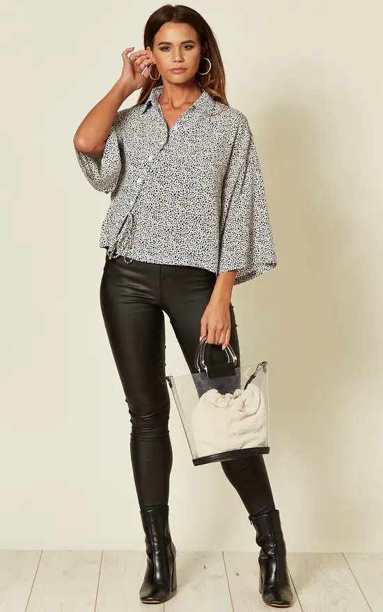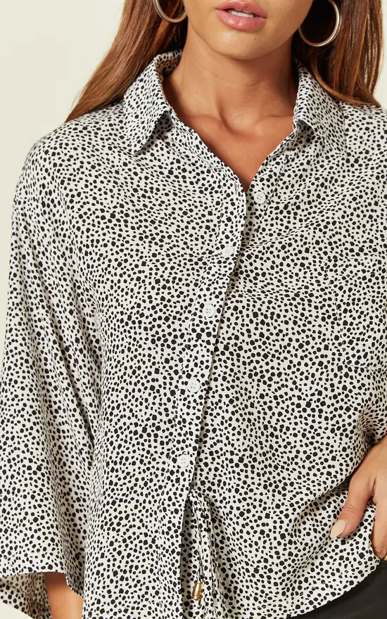 Make a statement in our oversized asymmetrical tie front shirt/blouse in black and white Dalmatian print. Perfect to dress up or down, from office to casual drinks.