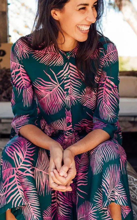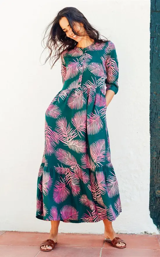 Our Lauren design is the perfect relaxed smock dress. Cut with a loose fit, it has a collarless shirt upper, half-length sleeves and an on-trend tiered skirt – with pockets. The Palm Fronds print features large Batik palm foliage in shades of pink, on a green base.